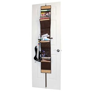 The ultimate necessity for any gaming enthusiast, this versatile rack rounds up cluttered gear and stores it neatly and accessibly behind closed doors. The unit provides three gusseted pockets, great for loading with DVDs, video games, and gaming guides, plus three mesh pockets that stretch to accommodate joysticks, controllers, electrical cords, and other equipment. Even more, two durable side straps grasp narrow items such as guitar necks and rolled-up game mats. The unit provides a top and bottom door hook and elastic straps that self adjust to fit multiple door heights, plus two wall hooks and two corresponding drywall anchors and screws--perfect for mounting to a playroom, game room, or bedroom wall. The rack's handsome bamboo accents lend it a sense of modern style, and its slender design means that two racks can be hung on the same door to house a large gaming collection. Simple to install and requiring no cumbersome assembly, the gaming rack comes with complete instructions and measures approximately 3 by 10 by 65 inches.